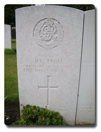 | Notes: | MMP. Awarded the 1914 Star, Victory and War Medals. First served abroad (1) France 14/8/1914 to 6/1/1918 He was born in Shoreditch, enlisted in Dalston and resided in Barclay Mews, Portman Square, London W. occupation Coachman. Enlisted 21/1/1901 enlisted in the 19 Hussars, served 4 years and 39 days, Army Reserve 5 years 197 days, MMP 7 years, 197 days, Served India 5 years, South Africa 1 year 328 days, POW Germany 3 years 136 days. Taken prisoner at the Battle of Mons, Repatriated in January 1918, incurably insane. 29/3/1918 Discharged. Died, Napsbury War Hospital, St Albans. Henry Edward Angel. Inscription on gravestone "Peace Perfect Peace".Information from Army Register of Soldiers' Effects 1901-1929. Angel, Henry Edmund, MMP, L/Cpl, 643, c/o Napsbury, 21/9/1918 widow Kathleen received £27-14-02, 30/9/1918 son Kenneth, born 22/2/1910 received £55--08-04, 22/12/1919 wife Kathleen received £7, 15/1/1920 OSB son Kenneth received £28-02-10.Info from Pension Index Cards:- Angel, Henry Edmund, No. 643, MMP, L/Cpl, 27/3/1918 Died, cause of death General paralysis of the insane aggravated by active service. Widow Kathleen Emily, 3 Berkley Mews, Portman Square, London W. 11/4/1818 she received a grant of £5. 1 Child, Kenneth Edward born 27/2/1910. 30/9/1918 she received a pension of 20/5d per week. Also Angel Henry Edmund, 5/3/1926, MMP, 643, 29/3/1918, VI 707-7, Man Insane, SFJ 621. Stamp: Ad 27/3/1918 at 30/- from 30/3/1918 to 14/4/1918, Chelsea No. VV501094, received 9/4/1918.Henry Edmund Angel.He has the same No. as Sgt N Dennis. MFP. |
