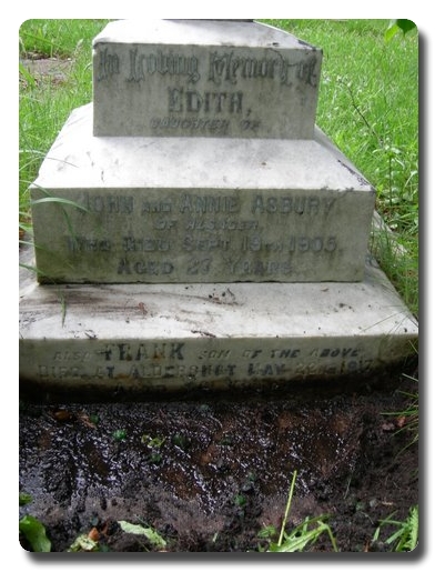 | Notes: | MFP. He was born in Crewe, enlisted in Chester and resided in Warrington. Died. His name is spelt Ashbury in soldiers died. Inscription on private Gravestone: In loving memory of Edith, daughter of John and Annie Asbury of Alsagar who died Sept 19th 1906, aged 27 years, also Frank, son of the above who died at Aldershot, May 22nd 1917, aged 26 years. |