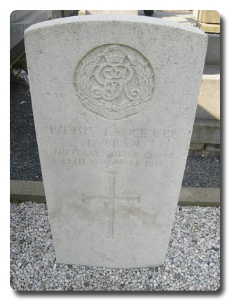 | Notes: | MMP. Awarded the Victory and War Medals. First served abroad (1) France, 28/1/1916. He was born in Helpston and enlisted and resided in Peterborough. Killed in Action. Formerly Dvr. Army Service Corps. No. T4/058004. No inscription on gravestone. Also shown as self inflicted injury in Army Registers of Soldiers' Effects, 1901-1929.Info from Pension Index Cards:- Killed 14/11/18. DFJ.88, case no DP 36. Bean, Ann, DP.36, MMP, 210 G N Cottages, New England, Peterborough, P/13315, A/L/Cpl, Daniel Bean, MMP. Also:- DEPENDANT'S PENSION CARD. D.1. Case passed to DPL/560, Northumberland Fusiliers, Bean, Daniel, P/13315, MMP, A/L/Cpl, 14/11/18 killed (S I). Dependant, Mrs Ann Bean, 210 G N Cottages, New England, Peterborough, relationship Mother.Daniel Bean. |