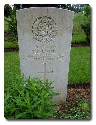| Notes: | MFP. Awarded the 1915 Star, Victory and War Medals. First served abroad (2a) Macedonia, Serbia, amended to (2b) Gallipoli, 2/9/1915 to 2/5/1916 and (4) Mesopotamia, 3/7/1916 to 24/10/1918. Born enlisted and resided in Bristol. Died. Formerly 7 Gloucestershire Regt. No. 7/10700 on medal card and 70709 in soldiers died. No inscription on gravestone. Died from illness, Army Register of Soldiers' Effects, 1901-1929, shown as Charles David Bessell in this register. 28/8/1914 he enlisted in the Gloucestershire Regiment, No. 70708, age 29.6 years, born St Phillips, Bristol, occupation Corrugator (Iron). 15/2/1917 transferred to MFP. 16/1/1919 died from bronco pneumonia at the War Hospital, Whitchurch. Served home 27/8/1914 to 1/9/1915, BEF 2/9/1915 to 2/5/1916, Mesopotamia 3/5/1916 to 24/10/1918, Home 25/10/1918 to 16/1/1919 Died. Father's address: 59 Barton Road, St Phillips, Bristol, 25/8/1919 his father received the following effects: packet of books, correspondence, 2 x cap badges, 3 Discs, 1 Belt, 1 mirror, 1 penknife, 1pr white slippers, crucifix, 1 metal ring, 1 Franc note, 5 coins and £5-16-2 halfpenny. 22/10/1915 he is shown as being admitted to Hill 10 Dressing Station and 27/10/1915 to 53 Casualty Clearing Station, Gallipoli, with dysentery. Info from Army Register of Soldiers' Effects, 1901-1929. 16/1/1920 his father received £46-15-08 including £25-10-00 war gratuity.Charles David BessellsInfo from pension index cards:- Bessell, Charles David, 16/1/19 Died, Single. Particulars of claimant, Sister Miss Emma Jane Bessell, 59 Barton Road, St Phillips, Bristol, born 13/7/1882. CLAIMANT. MPW5. dp77, 11/pp/59821, Bessell, Emma Jane, Man's name: Bessell, Charles David, P/11464, L/Cpl, MFP, relationship to man Mother. Also:- SB36D. D/21,59821. Particulars of Man: Bessell, Charles David, MFP, P/11464, L/Cpl, single, DIED 16/1/19, particulars of claimant: Bussell, Miss Emma Jane, 59 Barton Road, St. Phillips, Bristol, sister, born 18/7/82. Also:- DEPENDANT'S PENSION. D1. Bessell, C D P/11464, MFP, A/L/Cpl, 16/1/19 DIED from Brocho Pneumonia, Dependant Miss E J Bessell, 59 Barton Road, St. Phillips, Bristol. sister, gratuity £31.17.00 awarded 26/7/19Charles David Bessell. |