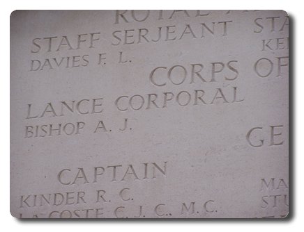 | Notes: | MMP. Awarded the 1915 Star, Victory and War Medals. 16/4/1918 died. First served abroad (1) France, 10/9/1915 to 16/4/18. He was born in Norwich, enlisted in Great Yarmouth and resided in Gorleston. Died. Formerly served in the Norfolk Regiment, No. 598/SR (Soldiers Died) and Pte 3, Army Cyclist Corps. No. 406. On or since 16/4/18, death presumed. Army Register of Soldiers' effects 1901-1921. Show as killed in action in medal roll page No.177. Info from Widows Pension Card: Arthur James Bishop, No. P/14745, MFP. Widow Ellen May Bishop of 14 Sussex Street, Gorelston on Sea who received a pension of 12/9 d + 15/10 d for her children, total 29/7 d per week. Info from Pension Index Cards:- Bishop, Mr E M, 14 Sussex Road, Gorleston on Sea, L/Cpl, P.14745, MFP A J Bishop. Also:- W5. Bishop Arthur, P/14745, MFP, L/Cpl, 16/4/18 Missing, 11/APW/4761, widow Ellen May, Northcote born 9/5/81, 14 Sussex Road, Gorleston Suffolk, 13/2/20 widow awarded £3, children Gladys May Bishop born 29/5/06, Mable Vera Bishop born 21/5/08, Arthur Edmond Bishop born 23/6/10., 20/1/19 widow and children awarded 30/- per week pension.Arthur James Bishop. |