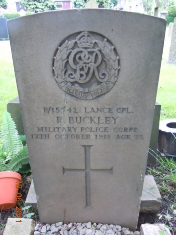 | Notes: | MFP. Awarded the 1915 Star, Victory and War Medals. First served abroad (2b) Gallipoli, 5/5/1915. Shown as (3) Egypt 10/9/14 to 12/10/15 on medal roll page B1159. He was born and resided in Royton and enlisted in Oldham. Formerl6y 1/10 Manchester Regiment. No inscription on gravestone.Info from Army Register of Soldiers' Effects 1901-1929. 17/10/1918 Died at the War Hospital, Chester.Info from Pension Index Card:- 81. Buckley, Theresa, 4 Stone Cottage, Royton, Oldham, P/15942, L/cpl R Buckley, MFP.Robert Buckley. |