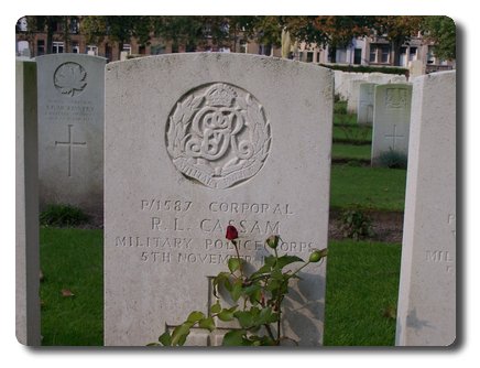 | Notes: | MFP. Awarded the 1915 Star, Victory and War Medals. First served abroad (1) France, 26/7/1915. He was born in Sevenoaks, enlisted in London and resided in Kensall Rise. Killed in Action. No inscription on gravestone. War Diary WO 95/409 4 Dismounted Traffic Control Unit, MFP. 5/11/17 No. P/1287 Sgt W Steadman and No P/1587 Cpl R L Cassam MFP and No. 4969 Pte H Gurney Army Cyclist Corps killed in Ypres by enemy shell. No. 8006 Pte P V Williams wounded in Ypres and evacuated. 6/11/17 Attended funeral of Sgt Steadman and Cpl Cassam at Prison Cemetery Ypres at 2.30pm.Info from Army Register of Soldiers Effects 1901-1929. 13/2/1918 he left his widow Kate £5/03/01, 11/11/1919 she received £11/10/00 war gratuity.Info from pension index cards:- Cassam, Robert Louis, P/1587, MFP, A/Cpl, 5/11/1917 KIA, widow Kate, born 18/2/1886 of 4 Compton Road, Kensall Rise, London, NW10 and 1 child Harold Leslie born 5/5/1907. 1/12/1917 she received a grant of £5. 20/5/1918 a pension of 26/3d per week, Later address of widow 31 Cobden Road, Sevenoaks, Kent.Robert Louis Cassam. |