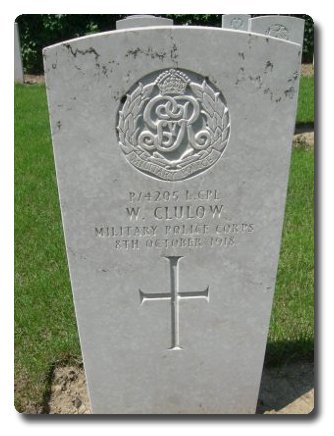| Notes: | MFP. Awarded the 1915 Star, Victory and War Medals. First served abroad (1) France, 4/10/1914 to 18/10/1914 and 27/2/1915 to 28/9/1915. He was born and resided in Bethnal Green and enlisted in London. Died illness. Formerly Pte. Royal Welsh Fusiliers. No. 10321. No inscription on gravestone. Extract from WO & Air Ministry Casualty List, 19/11/1918. Died.Military Foot Police. Clulow, 4205, L/Cpl W. (South Hackney E). |