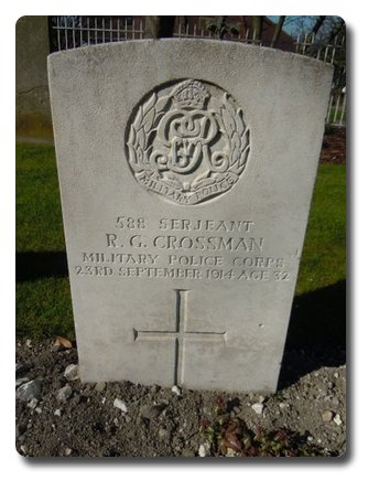 | Notes: | MMP. He was born at St. Luke's, London, enlisted in London and resided in Farnborough. Died of wounds. First BEF casualty to die of wounds in the UK. Awarded the 1914 Star, the Victory and War Medals. First served abroad (1) France, 13/8/1914 to 19/9/1914. Serving with 1 Division. He was born in London, enlisted 6/9/00, occupation French Polisher. No inscription on gravestone.Info from Army Register of Soldiers' Effects 1901-1929. died Military Hospital Fort Pitt, Kent, He has 2 x medal cards L G Crossman Victory and War Medals. and 2 x R G Crossman 1914 Star both with same details. Enlisted in the 1 Royal Dragoons, No. 4994, 6/9/1900. He transferred to the 8 Hussars, No. 6265 30/11/1903 to join his brother. Born St Lukes, Middlesex, occupation French Polisher. Served Home 6/9/1900 to 5/8/1901, South Africa 6/8/1901 to 25/9/1902, Home 26/9/1902 to 19/5/1905, Egypt 20/5/1905 to 23/3/1911, Home 24/3/1911 to 14/8/1914, BEF 15/8/1914 to 19/9/1914, Home 20/9/1914. Transferred to MMP 15/10/1904. Died at Fort Pitt Hospital, Chatham from wounds received in action serving with the Exp Force, admitted 21/9/1914, died 23/9/1914, Shell wound developed tetanus. Strange his has no clasp to 1914 star and died of wounds. Initials R G Richard George, initials on medal roll page B858 shown as L GEntry in De Ruvigny's Roll of Honour, Volume 3, page 68. CROSSMAN R G. Sergt. No. 588. Military Mounted Police, served with the Expeditionary Force in France. Died of Wounds 1914.Info from Pension Index Cards:- Crossman, Richard George, No. 588, MMP, Sgt, 23/9/1914 died of wounds received in action. Widow Alice Ada, born 2/1/1885, address: Malvern, Union Street, Farnborough, they had one child Jocelyn Alice Maud born 5/11/1912. 24/3/1915 his widow recerived 16/- per week pension.Richard George Crossman.Extract from the East Anglian Daily Times 28 October 1914. A further communique announces that Sergt. R G Crossman, Military Mounted Police, has died of wounds. |