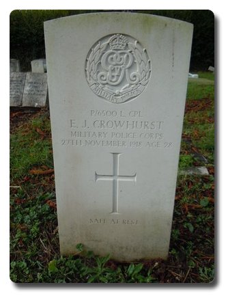 | Notes: | MFP. He was born in Tilbury, enlisted at Warley and resided in Shoeburyness. Died. He formerly served in the Essex Regt. No. 9411. Inscription on gravestone: At Rest. 24/1/1910 he enlisted in the 3 Essex Regiment Special Reserve No. 781 then Essex Regiment , No. 944 and No. 9411, age 19.1 years, born Tilbury Grays, occupation Railway Porter. 28/6/1916 transferred to Suffolk Regiment No. 30674, 29/1/1917 transferred to MFP. 27/11/1918 died Cliff Hospital Felixstowe. Father 2 John Street, Shoeburyness, Essex. Served Home 24/1/1910 to 28/2/1912, India 29/2/1912 to 24/11/1913, En Route 25/11/1913 to 6/12/1913, Mauritius 7/12/1913 to 7/12/1914, Home 8/12/1914 to 27/11/1918Info from Army Register of Soldiers' Effects, 1901-1929. 27/11/1918 Died from illness at Felixstowe. 10/5/1919 his mother Louisa received £25-11-10 including £15 war gratuity.Info from Pension Index Card:- Crowhurst, Edgar James, No. P/6500, MFP, A/L/Cpl. 27/11/1918 died from influenza, mother Louisa Crowhurst, 2 John Street, Shoeburyness, Essex, 22/7/1919 she received a pension of 5/- per week. Also:- DP80. Crowhurst, Louisa, 2 John Street, Shoeburyness, Essex, P/6500, A/L/Cpl Edgar J Crowhurst, MFP.Edgar James Crowhurst. |