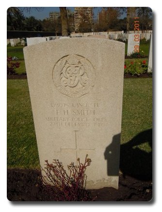 | Notes: | MFP. Awarded the Victory and War Medals. First served abroad (3) Egypt, 15/7/16 to 27/12/17. Shown as (1) France on medal roll page B 185. Died, Naserieh Military Hospital, Cairo, Army Register of Soldiers' Effects, 1901-1929. He was born in Upavon, enlisted and resided in Salisbury. No inscription on gravestone. Casualty List No. E12811, Egyptian Exp Force27/12/1917 P/3075 L/Cpl F H Smith died from Pneumonia.Francis Henry Smith. |