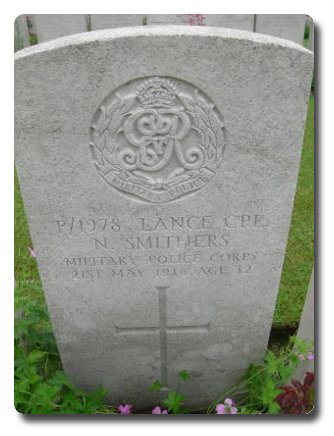 | Notes: | MFP. Awarded the 1915 Star, Victory and War Medals. First served abroad (1) France, 18/11/1915 to 21/5/1916. Died of Wounds 21/5/16. He was born in Pyrford, enlisted and resided in Guildford. Family lived on the Green, Pyrford, Nr Woking, Surrey. Inscription on gravestone: Gone but not forgotten. Served in the Surrey Constabulary No. 1456.Info from Army Register of Soldiers' Effects, 1901-1929. Smithers, Noah, MFP, L/Cpl, P/1978, died 21/5/1916, France & Belgium. 12/7/1916 Mother Emily, sole Leg was awarded £8-16-7, 22/8/1919 awarded £3 war gratuity.Info from Pension Card Index: Dependant's Pension. Smithers Noah, No. P/1978, MFP, L/Cpl, 21/5/1916 died of wounds. Dependant Mrs Emily Smithers, mother, Green Side, Ripley later 25 Glenese Road, Weybridge, Surrey. 28/11/2916 awarded pension of 5/- per week. She is shown on Claimant Card as deceased 20/3/1924.Noah Smithers.Extract from the Derby Daily Telegraph, 9/6/1916, Local Casualties.Died of Wounds, Military Foot Police, Smithers, P/1978, L/Cpl N (Ripley). (He was from Ripley, Surrey not Ripley, Derbyshire). |