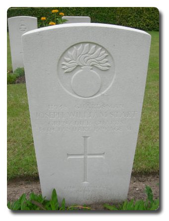 | Notes: | MMP. Awarded the 1914 Star, Victory and War Medals. First served abroad(1) France, 13/8/1914. Formerly Pte 2 Grenadier Guards. No. 11948. Died. He was born and resided in Bermondsey and enlisted in London. Inscription on gravestone: Till we meet again. The badge and No. on gravestone are that of the Grenadier Guards.Info from pension index card: Joseph Start, No. P/13889, L/cpl, MMP, 14/1/1919 died from pneumonia on active service, widow Agnes Start, born 15/4/1887, married 18/12/1912, of 18 Wendover Road, Staines, Middlesex. 10/2/1919 awarded £5 grant, 28/7/1919 given 13/9 d per week pension.He also has a Widows' Pension Sheet containing same information.Joseph William Start. |