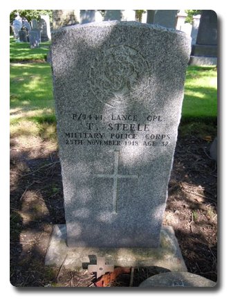 | Notes: | MFP. Awarded the 1915 Star, Victory and War Medals, first served abroad (1) France, 26/3/15 to 30/6/1917. He was born, enlisted and resided in Aberdeen. Died Connaught Hospital Aldershot, Army Register of Soldiers' Effects, 1901-1929. Formerly Pte C Company, 4 Gordon Highlanders, No. 2071. No inscription on gravestone.Info from Pension Index Card: Steele, Thomas, MFP, No. 9441, L/Cpl, Claimant Margaret Steele, 18 Canal Street, Aberdeen, mother.Thomas Steele. |