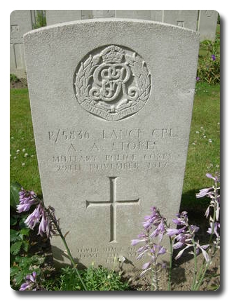 | Notes: | MFP. Awarded the Victory and War Medals. First served abroad (1) France, 13/3/1917 to 29/11/1917. He was born in Powick, enlisted in Worcester and resided in Halesowen. Killed in action. Inscription on gravestone: God loved him and so did we love, his wife Lill. He enlisted age 24 years and resided at the Police Station, New Road, Halesowen. Formerly a Civil Policeman . Served Home 28/12/1916 to 19/3/1917, BEF 13/3/1917 to 29/11/1917. 29/11/1917 killed in action whilst serving with the Expeditionary Force, France. Casualty List C/1412 dated 16/12/1917, Military Foot Police. P/5836. L/Cpl Stokes A K. KIA 29/11/1917, Reported by OC No1 Traffic Control Company, 1/12/1917.Info from Army Register of Soldiers' Effects, 1901-1929. 6/3/1918 he left his widow Lilly £1-12-10 11/11/1919 a further £3 war gratuity.Arthur Alfred Stokes.Roll of Honour, Killed in Action. Worcestershire. - Pte Stokes, Military Mounted Police, Foot Police). Police Review, 17/5/1918, page 156. |