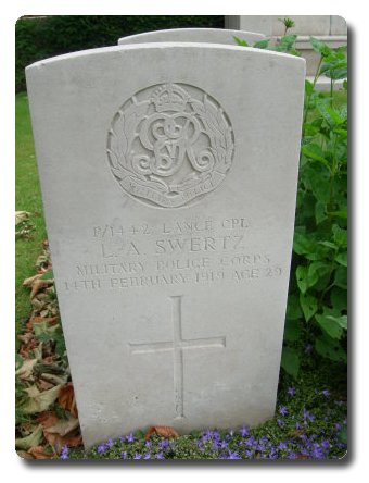 | Notes: | MFP. Awarded the 1915 Star. First served abroad (1) France, 21/6/1915. He was born in Cork, enlisted in London and resided in Kentish Town, London. Died (pneumonia). No inscription on gravestone. Info from Pension Card Index: Form MPAP 54. Swerty, (not Swertz) Gertrude, 1 Redhill Place, Albany Street, St Pancras, London.Info from Army Register of Soldiers' Effects, 1901-1929. 26/5/1919 he left his widow Gertrude,£24-12-05 amfd 20/4/1921 £9. (name shown as Swerty).Leopold Alphonsus Swertz. |
