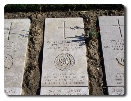| Notes: | MMP. Awarded the 1914 Star, Victory and War Medals. First served abroad (1) 19/9/1914 to 12/4/18. He was born in Ringwood, enlisted in Winchester and resided in London. Died of wounds, 2 Australian General Hospital, Boulogne, Army Register of Soldiers' Effects, 1901-1929. Formerly Pte. 1 Hampshire Regt. No. 5687. Inscription on gravestone: Greater love hath no man than this that a man lay down his life for his friends. Info from Pension Index Card:- 11/ARW/3867. Targett, Ernest Henry, P/5504, MMP, L/Cpl, 12/4/18 Died of Wounds, widow Florence, 35 Mernely Street, South Lambeth road, London SW, born 23/1/18, 24/4/18 she was awarded a £5 grant. 14/10/18 widow awarded 13/9 per week pension.Ernest Henry Targett. |
