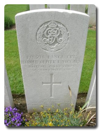 | Notes: | MFP. Awarded the Victory and War Medals. First served abroad (1) France, 16/4/1917. He was born in Newton Regnall, enlisted and resided in London. Died. Inscription on gravestone: Dear son you are not forgotten, we will always remember you. Mother. Medals claimed by his mother Mrs Sarah Viccars, 23 St Michael Street, Folkstone. Harold Oliver Lee Viccars.Army Registers of Soldiers' Effects: 5/11/1915 died from illness, 2/8/1919 father Alfred received £00-4-00, 6/3/1919 received £2-06-04, 7/12/1919 received £7-00-11. Harold Oliver Leo Viccars. Extract from the North Bucks Times and County Observer 19 November 1918.LITTLE BRICKHILL. DIED IN FRANCE - The death took place in France on November 5th from pneumonia following influenza of Detective Harold Viccars, of the Military Foot Police. He was very well known and had many friends in the village. he joined the London Constabulary in which he was doing well when called out to the front and there he served with the Military Foot Police as a detective. His many friends will deeply deplore his death almost at the time peace was about to be declared. He was the son of PC Viccars, lately of Little Brickhill. |