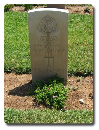 | Notes: | RMP. 6 Airborne Div Pro Coy. He enlisted in the General Service Corps, 20/12/1944 transferred to Royal Welch Fusiliers, 11/12/1945 transferred to CMP. 2/3/47 Died. At 20.00 hrs 1/3/1947 a land mind disguised as a kilo stone was detonated in Haifa as a Military Police jeep was passing. Two NCO's were Killed (L/Cpl's Wedge & Ogilvie) and two seriously injured. One of whom died later (L/Cpl Bond) of his wounds. Inscription on gravestone: " you did your duty bravely God bless you" Frederick Henry John Bond. |