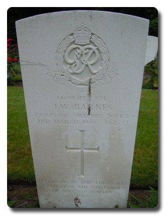 | Notes: | CMP. Enlisted in the General Service Corps, transferred to CMP. He was born and resided in Somerset. Casualty List 2018/2, Western Europe, Died, 2/3/1946, (shown as Bdr. Royal Artillery).6/9/49 War Medal.Address:- Mrs G Barnes, 18 Cornwall Road, Shepton Mallett, Somerset.Inscription on gravestone: Forever in the thought of his dear wife and family of Shepton Mallett. Not listed in Crozier Roll or Army Roll of Honour.James William Barnes. |