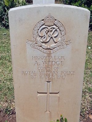 | Notes: | RMP. He enlisted in to the GSC transferred to CMP. Palestine Pro Coy. 1/3/47 Died age 20 years. Medal card not found.At 20.00 hrs 1/3/1947 a land mind disguised as a kilo stone was detonated in Haifa as a Military Police jeep was passing. Two NCO's were Killed (L/Cpl's Wedge & Ogilvie) and two seriously injured. One of whom died later (L/Cpl Bond) of his wounds. He served in the Haifa Detachment, Palestine Command Pro Coy. No inscription on gravestone.Albert Wedge. |