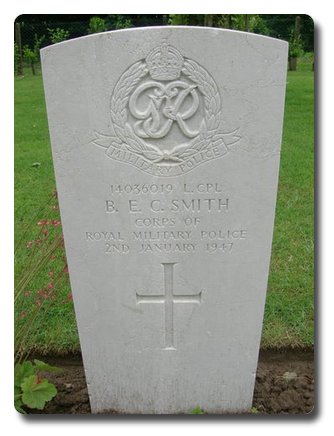 | Notes: | RMP. 112 Pro Coy. 2/1/47 Died in an accident. Medal card not found.No inscription on gravestone. Bruce Ernest Crosbie Smith. Extract from the Liverpool Echo, 24/1/47. Killed in Italy Crash. News has been received by Mr and Mrs J E Smith of Wheatridge, Burton, Wirral formerly of Wallasey, of the death in the Twenty Second General Hospital, at Padua, Italy of their only son, Lance Corporal Bruce Smith, 112th Provost Coy, Corps of Royal Military Police, CMF in his twentieth year. He was taken to hospital suffering from head injuries as a result of his jeep colliding with a lamp standard. He joined the Army two years ago, served with the King's Own Royal Regiment for twelve months, and volunteering for the Military Police was transferred last February to the CRMP, and had been in Italy eleven months.(article has small picture of L/Cpl Smith.) |