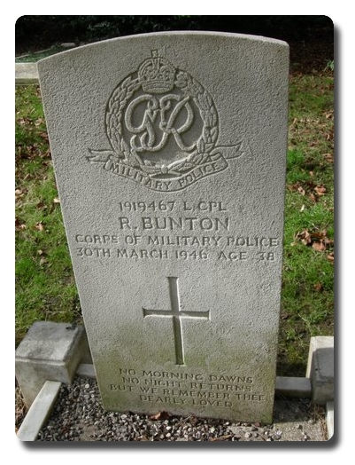 | Notes: | CMP. 1/2/1940 he enlisted in the Royal Engineers, age 34 years, born 5/1/1908, 18/6/1943 transferred to CMP. No Casualty List found. Inscription on gravestone: No morning dawns, no night returns, but we remember three.Ronald Bunton |