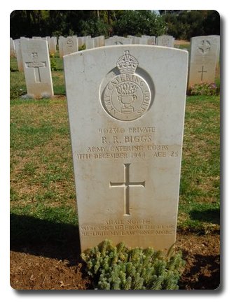 | Notes: | ACC attached to CMP 116 Pro Coy. He was born and resided in Essex and formerly served in the Royal Artillery, 17/8/1942 transferred to Army Catering Corps. 116 Pro Coy War diary WO 170/3552. 10/12/1944 No. 902350 Pte. Briggs R ACC, attached wounded by ELAs whilst returning sniper fire. Body missing. 16/12/44 Pte. Biggs, ACC attached killed and buried by ELAs.Casualty Lists 1644/3, Greece, missing believed killed, 11/12/1944. Attached to CMP. Casualty Lists 1673/2 Greece, previously reported missing believed killed 11/12/1944 now reported killed in action, previous list 1644, 11/12/1944. Attached to CMP.Medal card not found.Inscription on gravestone: Shall not he who sent me from the door re-light my lamp once more. Richard Briggs. |