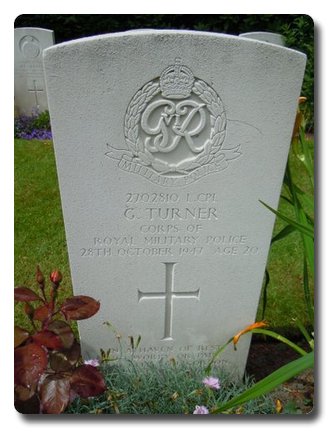 | Notes: | CMP/RMP. 28/10/47 Died. Enlisted Scots Guards, transferred to CMP. TC. 103 Pro Coy. He died on the same day as L/Cpl W Houghton of the same unit. Medal card not found.Inscription on gravestone: In a haven of rest, no worry or pain, God keep you Gordon till me meet again. Gordon Turner. |