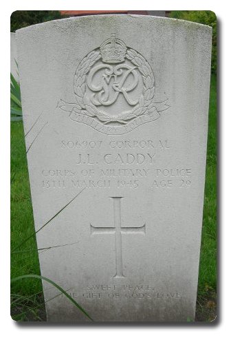 | Notes: | CMP. From Middlesbrough, born Chester le Street, he enlisted in the Royal Artillery, 27/2/1931 discharged, para 370 (VA) KR,5/1/1934 he re enlisted in the Coldstream Guards, 2/12/1942 transfer to CMP. He is not listed in Crozier's Roll of Honour or Soldiers Died. Guards Armoured Division Pro Coy War Diary WO 171/4116. 13/3/45 east of Gennep 22.40 hrs, 806907 W/Cpl Caddy J committed suicide by shooting himself in the head. Casualty List 1723/11, Western Europe, Died, 13/3/1945. Medal card not found.Inscription on gravestone: Sweet peace, the gift of God's love.John Leslie Caddy. |