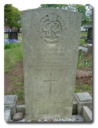 | Notes: | CMP. 6/4/45 Died. Not listed in Crozier Roll or Army Roll of Honour. He formerly served in the 5th Bn King's Shropshire Light Infantry transferred to CMP. TC. Casualty List not found.Medal card not found.Inscription on gravestone: From the rising to the setting of the sun we will remember. 4/3/43 Discharge. Henry Timmins. |