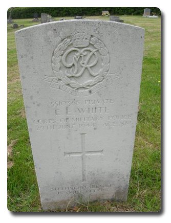 | Notes: | CMP. Enlisted Hampshire Regiment, 2/5/41 transferred to CMP. VP. 9/5/43 discharged. 29/6/44 Died.Not listed in Crozier Roll of Honour or Soldiers Died.Casualty List not found.Medal card not found.Inscription on gravestone: Sleeping peacefully in God's keeping. Ernest Edward White. |