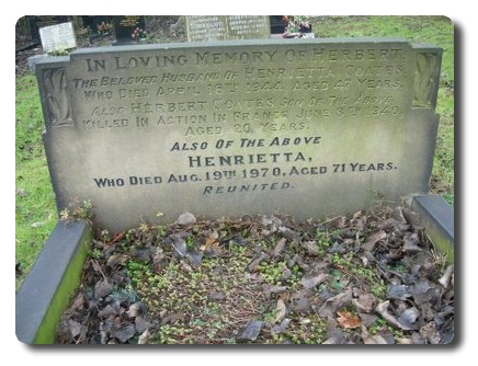 | Notes: | CMP. 16/4/44 died. Formerly Royal Army Service Corps, later West Yorkshire Regiment. 28/7/41 Transferred to CMP. VP. 27/7/43 Discharged. Born 15/6/1896. 16/4/44 Died. Not listed in Crozier or Army Roll of Honour. No Casualty List found. Inscription on gravestone: In loving memory of Herbert beloved husband of Henrietta Coates who died April 16th 1944, age 47 years, also Herbert Coates son of the above killed in action France June 8th 1940, aged 20. Also of the above Henrietta who died August 19th 1970, aged 71 years. Re-united. The son 4691621 Pte. Herbert Coates, 2/4 Kings Own Yorkshire Light Infantry was killed in action 9/6/40 serving with the BEF in France. He is buried in St Desir War Cemetery, Calvados, France.Herbert Coates. |