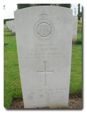 | Notes: | Provost Officer. Royal Fusiliers. 3 Div Pro Coy. He was born in Essex and resided in London SW. 3 Div Pro Coy War Diary WO 171/423. 21/6/1944. Lt Wilson Royal Fusiliers killed by shrapnel from enemy shell fire at Cazelle. PM 1 Corps HQ War Diary WO 171/281. 21/6/44 D+15 Lt Wilson, 3 (Br) Div pro coy killed by shell splinters south of Cazelle. Casualty List (Officers) 1491, North West Europe, Died of Wounds, 21/6/1944. Casualty List 1533 (Officers), corrections, Previous List 1491, North West Europe, Died of Wounds, Royal Fusiliers, Wilson, W/Lt, G L, 219101, 21/6/1944, casualty should read Killed in Action.Medal card not found.Inscription on gravestone: Loving memory of my husband, died for his country, sweet Jesus have mercy on his soul. Guy Lewis Wilson. |