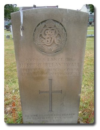 | Notes: | MFP. Awarded the Victory and War Medals. First served abroad (1) France, 6/12/1916 to 1/2/1917. Formerly Pte. Liverpool Regt. No. 22/47377. Resided in Liverpool. Not listed in Soldiers Died. Inscription on gravestone: In life I loved him dearly, in death I do the same. Wife and Baby. Info from Service Record: Herbert Ireland Wall, No. 22/47377 22 Kings Liverpool Regiment, age 33.2 years, occupation Lime Yard Clerk, address: 8 Vicars Close, Edge Hill, Liverpool. enlisted 9/12/1915, B Army Reserve 10/12/1915 to 26/7/1916, Home 27/7/1916 to 5/12/1916, France 6/12/1915 to 1/2/1917, home 2/2/1917 to 23/7/1918 discharged no longer fit for war service. 3/11/1912 he married Maud Hetherington at Liverpool, address: 8 Vicars Grove, Edge Hill, Liverpool they had one son Herbert John born 29/8/16 and died of gastritis 19/518.Info from Army Register of Soldiers' Effects, 1901-1929 but no other information. 3/2/1919 died. 27/4/1920 his widow Maude received £9 war gratuity. Info from Pension Index Cards: Herbert Ireland Wall, No. P/12088, MFP, A/L/Cpl, discharged 3/2/1919 tuberculosis of lung attributed to active service. Also:- 3/APW/602. Widow Maud Wall, born 17/1/1889, address: 30 St. Agnes Road, Liverpool, they had one child Phyllis Gertrude born 12/10/1918. They are also shown as having a son Herbert John, born 29/8/1916 who died 19/5/1918 from gastritis and convulsion. 5/8/1919 widow received a grant of £6, 5/2/1919 she received a pension of 30/5 per week.Herbert Ireland Wall. |