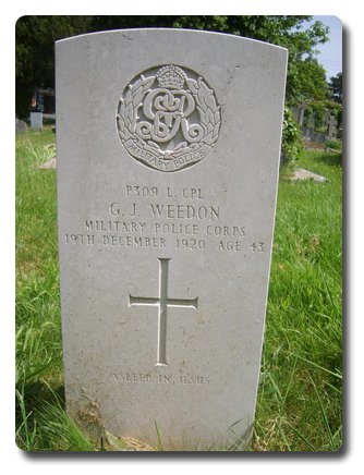| Notes: | MFP. From Farnham Common. Not listed in soldiers died. Awarded the 1914 Star, Victory and War Medals. First served abroad (1) France, 18/10/1914 to 13/8/18. 19/12/1920 Died. He has 2 x medal cards, 1 x George J Weeden, SWB and 2 x G Weedon, 1914 Star, Victory and War Medals.Info from Pension Index Cards:- widows pension card, 11/APW/3368. Weedon, George James, No. P/309, L/Cpl, MFP. Name of widow Sylvia Margaret Weedon, James Cottages, Farnham Common, Slough, Buckinghamshire. 22/12/1920 Paid a pension of 26/8 per week. Also:- W1. To Region II. WFJ.307. Weedon, George James, P/309, MFP, L/Cpl, 19/12/20 DIED phthisis, Widow, Sylvia M, James Cottages, Farnham Common, Bucks, born 22/6/79, 2/3/21 widow awarded £5 grant. Also:- Weedon, George James, P/309, Corps of Military Police, children nil, 11095-60, 19/10/18, place of discharge Military Hospital. Litchfield. Also:- DIED 19/12/20. Weedon, George Jamers, MFP, P/309, 17/10/18 to discharge, SFJ.1261, James Cottage, Farnham Common, Nr Slough, Bucks, file destroyed 4/10/27. Stamp: Ad 14/11/18 at 15/- from 18/10/18 to 21/10/19, Chelsea no. VV50.1728, received 15/11/18. 11/M/54119.George James Weedon. |
