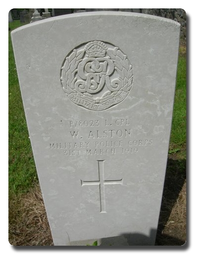 | Notes: | MFP. Not listed in soldiers died. No inscription on gravestone. Enlisted 20/11/1914, age 36 in the Royal Sussex and transferred to the MFP 26/7/1917. Served Home 20/11/1914 to 7/11/1918. Prior to enlistment he had been a copper miner in Arizona, United States. He was born in Clitheroe, Lancashire and enlisted at Brighton, Sussex. Discharged 7/11/1918 with heart disease caused by training and exposure. Awarded the Silver War Badge, list MPC/100 name erased there from, re-submitted on List MPC/125. Unit, MFP No 8 (Kent) Area, Eastern Command. His wife resided at 931 Woodbridge Road, Ipswich. Info from Pension Index Cards:- W1. Alston, William, P/8023, MFP, A/L/Cpl, discharged, widow Katherine, 2 High Grange Road, Spennymoor, refused 30/5/19. Also:- Alston, Katherine, 144, 2 High Grange Road, Spenn6y Moor, P/8023, A/L/Cpl, William Alston, MFP.William Alston. |