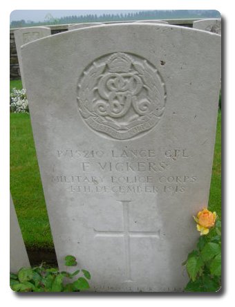 | Notes: | MFP. Awarded the Victory and War Medals. 28/20/1915 he enlisted in the Lancashire Fusiliers, No. 201990, age 18.11 years, single, address: 5 union Street, Heady Hill, Heywood, Lancashire. 26/4/1917 he received a General Court Martial for a self inflicted gun shot wound to the palm of his hand and loss of middle finger of right hand, awarded 30 days field punishment No.1. 23/9/1917 transferred to the Labour Corps No. 377711, 16/2/1918 transferred to the MFP at Dunkirk, 28/5/1918 with 3 army, 18/6/1918 with GHQ Troops, 8/11/1918 returned to Labour Corps, 4/12/1918 he died at 50 CCS from Bronco Pneumonia. Inscription on gravestone: Gone but not forgotten, (his gravestone has the badge of the Military Police Corps but should have Labour Corps). No mention of MFP service on medal index card.Info from Army Register of Soldiers' Effects 1901-1929. Vickers, Fred, 209 Div Employment Company, Labour Corps, Pte. No. 377711, 4/12/1918 Died at 50 CCS, France, Pay Office Nottingham, 6/19, Including War Grant £18, 12/8/1919 father William received £19-18-00.Info from Pension Index Card: Vickers, Fred, Labour Corps, No. 377711, Pte, Died 4/12/1918, Claimant: Vickers, W E, 5 union Street, Headey Hill, Heywood, Lancashire, father, born 1868, he died 24/6/1924 claim transferred to Mother Sarah June Vickers.Fred Vickers. |