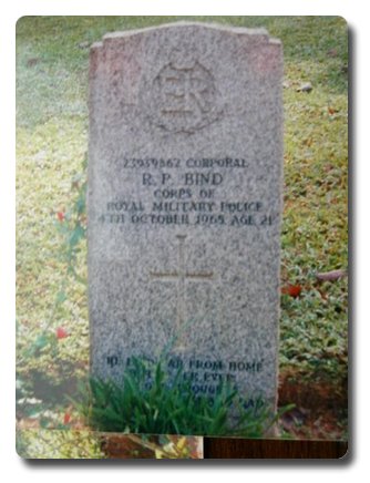 | Notes: | RMP. 4/10/1965 Died. Cause of death a road traffic accident, Brunei, Borneo. Grave Reference: Plot 11 Row A Grave 18. Born 8/6/1944. Roy Phillip Bind. |