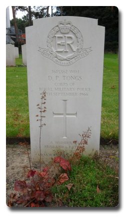 | Notes: | CMP/RMP. Enlisted in CMP. Died 14/9/1966. Cause of death natural causes, Berlin. Inscription on gravestone: A wonderful husband and father is gone but memories will linger on. Grave Reference: Post War Plot Row J Grave 17. Born 29/5/1917. Shown on RMP Nominal Roll 12/1952 Sgt. Donald Percy Tongs.Extract from the Daily Record, 25 November 1961. "Why RSM hit me" - corporal. A regimental sergeant-major of the Royal Military Police was accused yesterday of hitting a lance corporal because his stomach was sticking out. RSM Donal Percy Tongs, 45, a Regular, was charged at Singapore with striking L/Cpl Andrew Anderson on the stomach with a pace stick on the parade ground on the morning of November 6.Slapped Twice. - Tongs, attached to0 200 Provost Company, pleaded not guilty. He comes from Doncaster, Yorks. Anderson, 25, said that whilst parading that morning the RSM singled him out as an example. "The RSM pointed out to a squad of 20 that I had and exceedingly low stomach. The RSM slapped me twice on the stomach with the back of his hand, " he said. "Before I joined the tanks the FRSM shouted I was a bloody disgrace for a man of my Age," Anderson added. Then Anderson told the court: "A few minutes later as I came to a bad halt, the RSM shouted at me to put my stomach in and hit me with the pace stick. "As a result I had a six inch long red mark and had to hold my stomach". Cross- examined, Anderson admitted the parade was in preparation for the new Provost Marshal's arrival and that he had criticised the RSM's drill instruction in his mind. An Army doctor who examined Anderson said the found a six inch red mark which was tender. The hearing goes on today. |