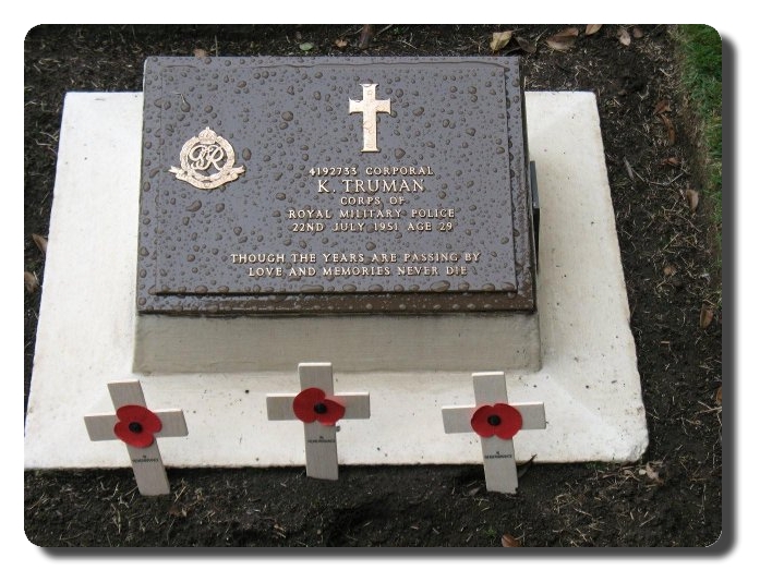 | Notes: | CMP/RMP. Died 22/7/1951. Formerly Royal Welch Fusiliers, transferred to CMP. Casualty List 1513/26 North West Europe, Wounded, 11/7/1944. Casualty List 1727/25, Western Europe, Wounded, 25/3/1945. 22/7/1951 cause of death non operational accident, Japan. Age 29. Grave Reference: Post War Plot B Row D Grave 1. Born 9/7/1922. Medal card not found.Kenneth Truman. |