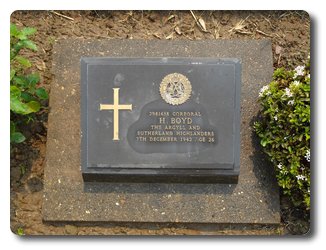 | Notes: | CMP. POW. He enlisted in the Argyll & Sutherland Highlanders, attached to CMP. He was born and resided in Argyll and enlisted in the 2 Argyll & Sutherland Highlanders. Shown as Argyll & Sutherland Highlanders in CWGC but shown as CMP in Kinsyoke POW Burial Ground book, which shows he was buried in grave 21 in Kinsayoke Camp Burial Ground. Not listed in Cutts paper. He was born and resided in Argyllshire.Info from Japanese POW Index Card: Boyd, Hector McDonald, born 14/8/1916, Cpl, No. 2981618, Unit 2 A & S H. 15/2/1942 captured Singapore, born Edinburgh, address: Mrs John McKinnen, Dairy Cottage, Isle of Coll, Argyll.He is shown in a list for British 4 Group (working party). He is listed on Kinsyoke Cemetery List, sheet 1, grave 21, POW No. 5867, 2981618,Cpl, Boyd, H, CMP, 17/12/1942 Died, from Dysentery. Also listed as Boyd,H, Army, Cpl, new POW No. IV3274, old POW No.IV 5867, 2981618, D 17/12/17.Casualty List, 250/5, BEF, France, Wounded 16/6/1940, 8 Argyll & Sutherland Highlanders. Casualty List 256/3,BEF, France, Wounded, 9/6/1940, Argyll & Sutherland Highlanders, 9/6/1940. Casualty List 492/9, BEF, France, Wounded, List 250, 8 Argyll & Sutherland Highlanders, 16/6/1940, (the above entry should be deleted, correctly shown on List 256, Casualty List 769/17, Malaya, Missing, Argyll & Sutherland Highlanders, 15/2/1942. Casualty List 942/18, Malaya, POW formerly reported as missing, shown as Argyll & Sutherland Highlanders.11/4/50 He was awarded the 1939 - 1945 Star, Pacific Star, Defence Medal, War Medal.Address:- "Arinagour", Isle of Coll, Argyll, Scotland.Hector McDonald Boyd. |