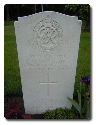 | Notes: | CMP (I). He enlisted in to the Machine Gun Corps (disbanded 1922) transferred to CMP. 17/7/45 to discharge.18/2/49 he was awarded the MBE, 1939-1945 Star, Burma Star, Defence Medal, War Medal, GSM 1918 Palestine. Address:- "Wimereux" Bedford Lane, Frimley Green, Aldershot, Hants.Frank Cannings.In Pensioner Royal Hospital Chelsea from 17/8/70, died 23/4/76, age 74. Grave Reference: Royal Hospital Chelsea Plot 4 Row K, Grave 11. |