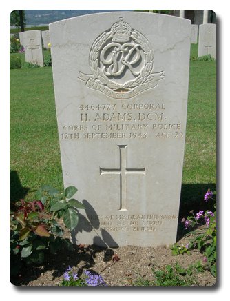 | Notes: | CMP. Enlisted in the Durham Light Infantry, 21/3/41 transferred to CMP 12/9/43 Died. From Bradford. 13/9/1943 Cpl Adams reported missing in forward area. 17/9/1943 AFW 3121 submitted recommending Cpl Adams for a Decoration. He is listed in the Story of the 46 Division 1939-1945 (Printed at the University Book Press "Styria", Graz, Austria) has having been awarded the Military Medal. Casualty List 1273/15, Italy reported missing, 12/9/43.Casualty List 1522/5, Italy, previously reported missing now reported Killed in Action previous List 1273, 12/9/43, missing 12/9/43. Inscription on gravestone: Memories of a dear husband he died as he lived every ones friend.Medal card not found. DCM.Harry Adams.Extract from Bradford Telegraph and Argus, 9/8/1944.Official news has been received from Mrs. H. Adams of 789 Little Horton Lane, Bradford that her husband Corporal Harry Adams previously reported missing has been killed in action. He joined the Army in 1940 and before that he was employed by his father. He was an active member of Horton Moravian Church. Bradford Telegraph and Argus 9/8/1944. |