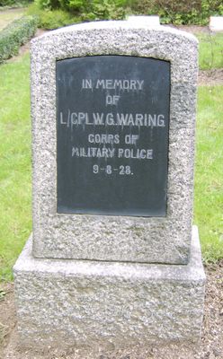 | Notes: | MMP. Formerly Driver, 28 Bde, RFA, No.59552 and 971545, transferred 14/2/1921. No.1044936 is a post 1920 Royal Artillery No. Awarded 1914 Star with clasp and roses, Victory and War Medal, Long Service and Good Conduct Medal. First served abroad (1) France, 19/8/1914. Address in 1924: E Coast Battery, HQ Northumbrian Area, Catterick. Shown on medal card as having died and medals re-issued to a Mrs Rooker. Died as Wiesbaden, Germany, 9/8/1928. Wiesbaden was the HQ BAOR after 1926 when it moved from Cologne. Inscription on private gravestone; IN MEMORY OF L/CPL W G WARING, CORPS OF MILITARY POLICE 9/8/28. He left the sum of £40.3.4. Army Register of Soldiers Effects. William George Waring.Extract from the Halifax Evening Courier 15 August 1928.DEATHS IN TRIOS. Rhine Army Superstition.Cologne, Wednesday. It is a remarkable fact that a sudden death in the Rhine Army is always followed within a space of a fortnight by two other deaths. This coincidence dates back to the early days of the occupation and old members of the garrison always point to ti. The sudden death of Cpl. Kempson, Royal Welch Fusiliers, who fell from a window at Theluvelt Barracks, sustaining frightful injuries has been followed by the death of L/Cpl Waring, military mounted police and the day old son of Sergt. and Mrs. Taylor, RAMC. L/Cpl Waring was being treated for a knee injury and underwent a slight operation in the military hospital. he collapsed when under the anesthetic and despite every effort of the doctors present died within a minute. Everything possible was done to revive the unfortunate patient, but, after two hours, the doctors were forced to admit themselves beaten. It is stated that L/Cpl Waring died from heart failure. |