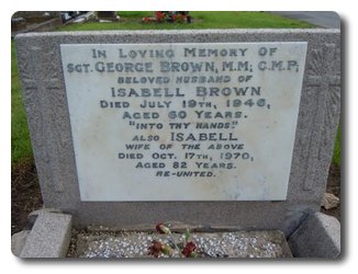 | Notes: | CMP. Enlisted in to CMP. Died at the age of 60. Not listed in soldier died or Crozier roll of honour. Awarded the Military Medal, details not known. No Casualty List found. Inscription on private gravestone: Into thy hands.George Brown. |